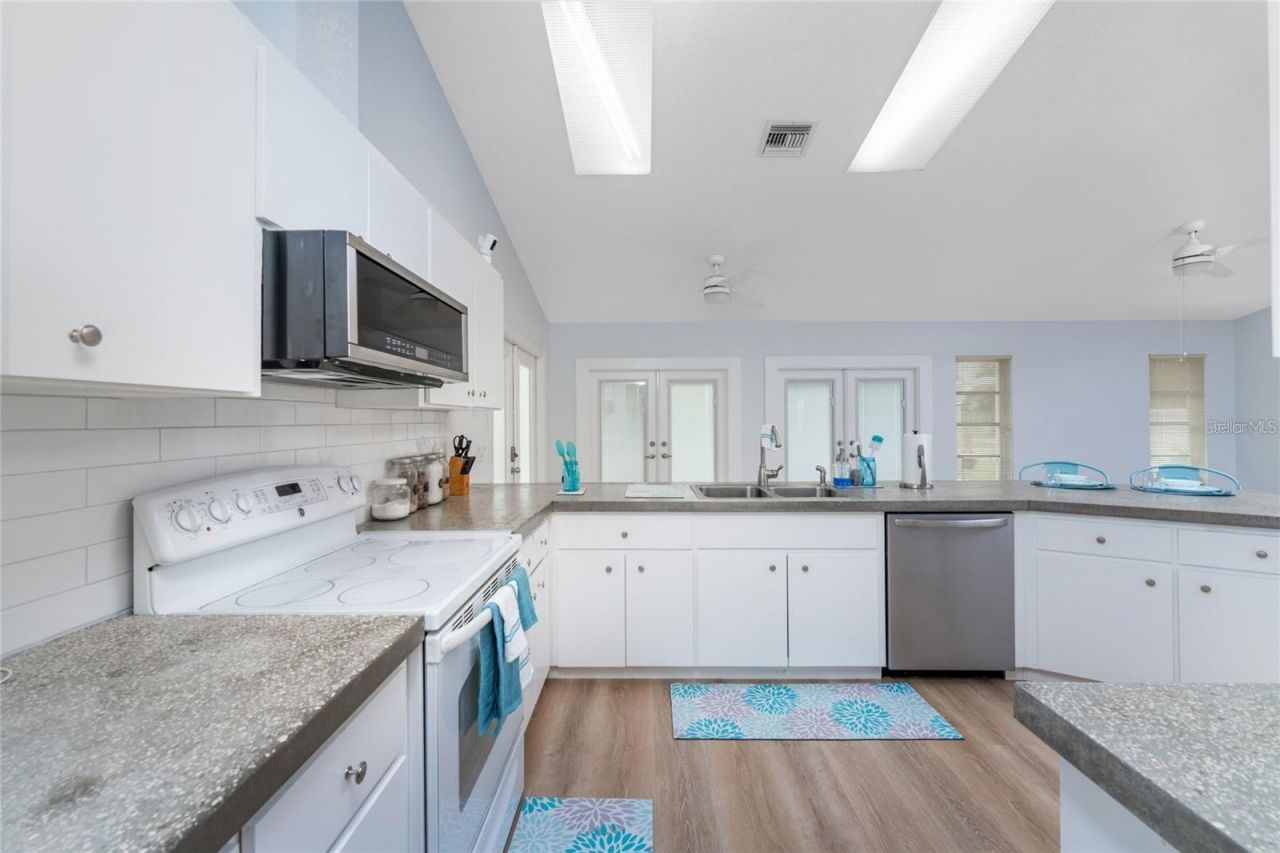 One or more photo(s) has been virtually staged. Welcome to your future oasis! NESTLED ON NEARLY AN ACRE, with access from 3 streets, this IMPRESSIVE 3-BEDROOM, 3-BATH, POOL HOME offers the perfect blend of spacious living, modern convenience, and tranquil outdoor retreats. This home is open with high ceilings and a SPLIT FLOOR PLAN. The kitchen offers a breakfast bar, RECENTLY UPDATED STAINLESS STEEL APPLIANCES, pantry closet. The master suite provides a walk in closet and ensuite bathroom and FRENCH DOORS TO THE LANAI AND POOL. In the main living area you'll also find easy access to your expansive outdoor area through one of 3 sets of French doors where you can dive into the LUXURIOUS POOL or just relax with your morning coffee or afternoon cocktail - your personal backyard paradise awaits. The screened in lanai and pool area is perfect for hosting gatherings, barbecues, or simply soaking up the Florida sunshine. The home features a two-car garage and two sheds providing ample space for projects and storage. This home is ready for your personal touch, it boasts great bones and SIGNIFICAN RECENT UPGRADES. The ROOF was replaced in 2023 and has a transferrable warranty. the AC system was replaced in 2017. The interior has been recently repainted, new windows in the guest bedrooms, luxury vinyl in the living areas and vinyl plank in the primary bedroom. ADDITIONAL FEATURES include 30 AMP CAMPER/RV PLUG, WIFI controlled IRRIGATION and a CAMERA SYSTEM around the home. Bluetooth speaker, fan, light, combo, in master/primary bathroom. This unique property offers the perfect balance of privacy and convenience with a combined 3 LOTS and 3 ACCESS GATES. Enjoy quick and easy access to shopping, dining, beaches and golf courses. And with no HOA and a triple-sized lot you'll find plenty of privacy along with room for your boat, RV, and other toys. NOT IN A FLOOD ZONE. This is a rare opportunity to own a spacious property.