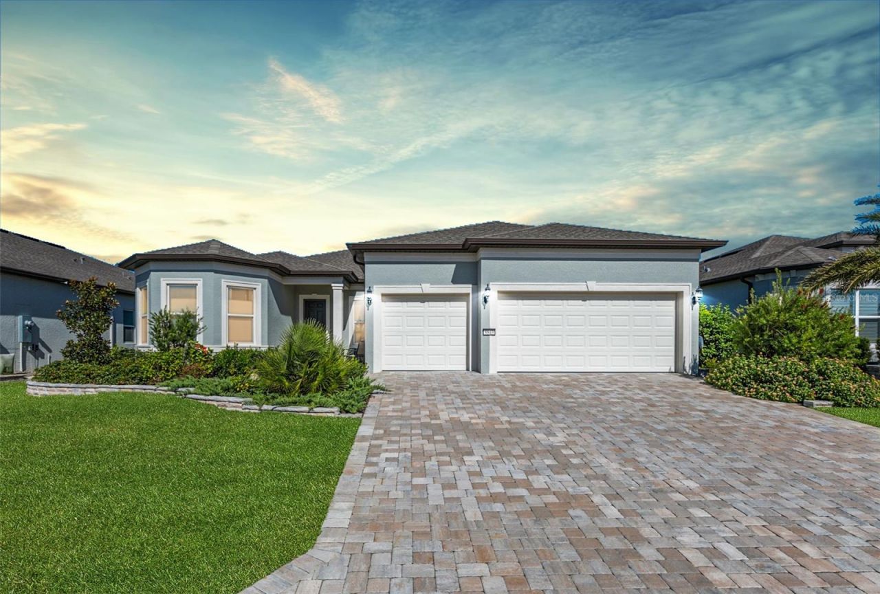 Live the Lifestyle You Deserve in this home with priceless golf course views and coveted water vistas in the gated 55-plus Stone Creek golf community with world-class amenities. This nearly new three-bedroom, three-bath Stellar model home includes a versatile flex room and elegant designer finishes throughout. Positioned on a premium lot overlooking the 14th green, this thoughtfully crafted residence offers comfort, beauty, and a lifestyle designed for relaxation and connection. From the moment you arrive, you'll notice the lush landscaping, stacked stone curbing, paver-lined driveway, and charming Craftsman details. A sense of spaciousness greets you in the open-concept design, where lofty ceilings and soft natural light create an atmosphere of refined ease. Luxury vinyl plank flooring flows throughout, framing a versatile living space ideal for both quiet reflection and stylish entertaining while enjoying the scenic views. The gourmet kitchen features quartz countertops, soft-close cabinetry with pullouts, an upgraded stainless steel appliance package with a Bosch refrigerator, a sizeable walk-in pantry, and reverse osmosis water filtration. A large island flows into the spacious gathering room, where pocket glass sliders open to a screened lanai and paver patio perfect for enjoying Florida's sunshine or hosting friends. The owner's suite is a true sanctuary, offering serene views, abundant natural light, a spacious walk-in closet, and a luxurious en suite bath. Pamper yourself in the spa-inspired bathroom, complete with a large, comfort-height double sink vanity and a tile-lined Roman-style walk-in shower with a transom window and seating ledge. Designed for versatility, the front guest bedroom with a bay window offers privacy with an en suite bath, while the second guest bedroom provides flexible space for a home office or hobby room. Additional comforts include a laundry room equipped with a laundry tub, cabinets for storage needs, and a folding area. A convenient catch-all mudroom leads to the three-car garage with epoxy-covered flooring, a dedicated EV charger, overhead storage, and ample space for a golf cart or workshop. This exceptional home is more than just a place to live; it's a gateway to an active and engaging lifestyle featuring a 24/7 staffed gated entrance for security and peace of mind. Luxury-inspired amenities include heated pools, a state-of-the-art fitness center, a spa, and relaxing hot tubs and saunas. Stay active with pickleball, bocce, tennis, and a softball field, while a dedicated lifestyle staff curates entertainment, activities, and special events to foster connections. Just beyond the gates, enjoy a golf course, pro shop, and restaurant-perfect for socializing and unwinding. Whether you're looking to relax, explore, or connect, this home is your gateway to it all.